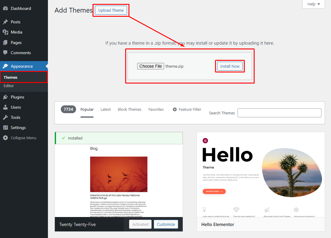 Browse to the domio.zip file and click Install now for the theme to be uploaded and installed.