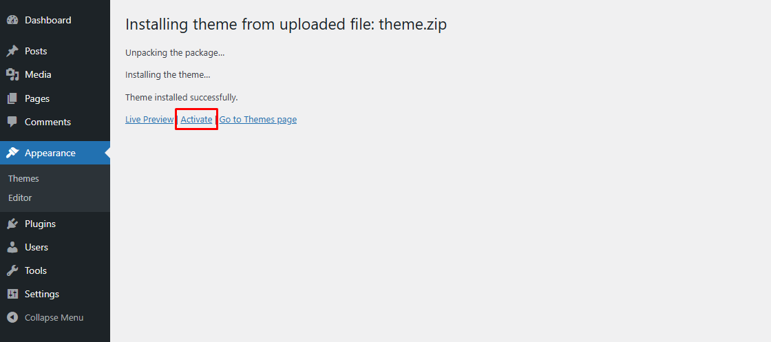 After you download the package from ThemeForest, please unzip it. You'll see a file called theme.zip, which is the main file needed to upload and install.
