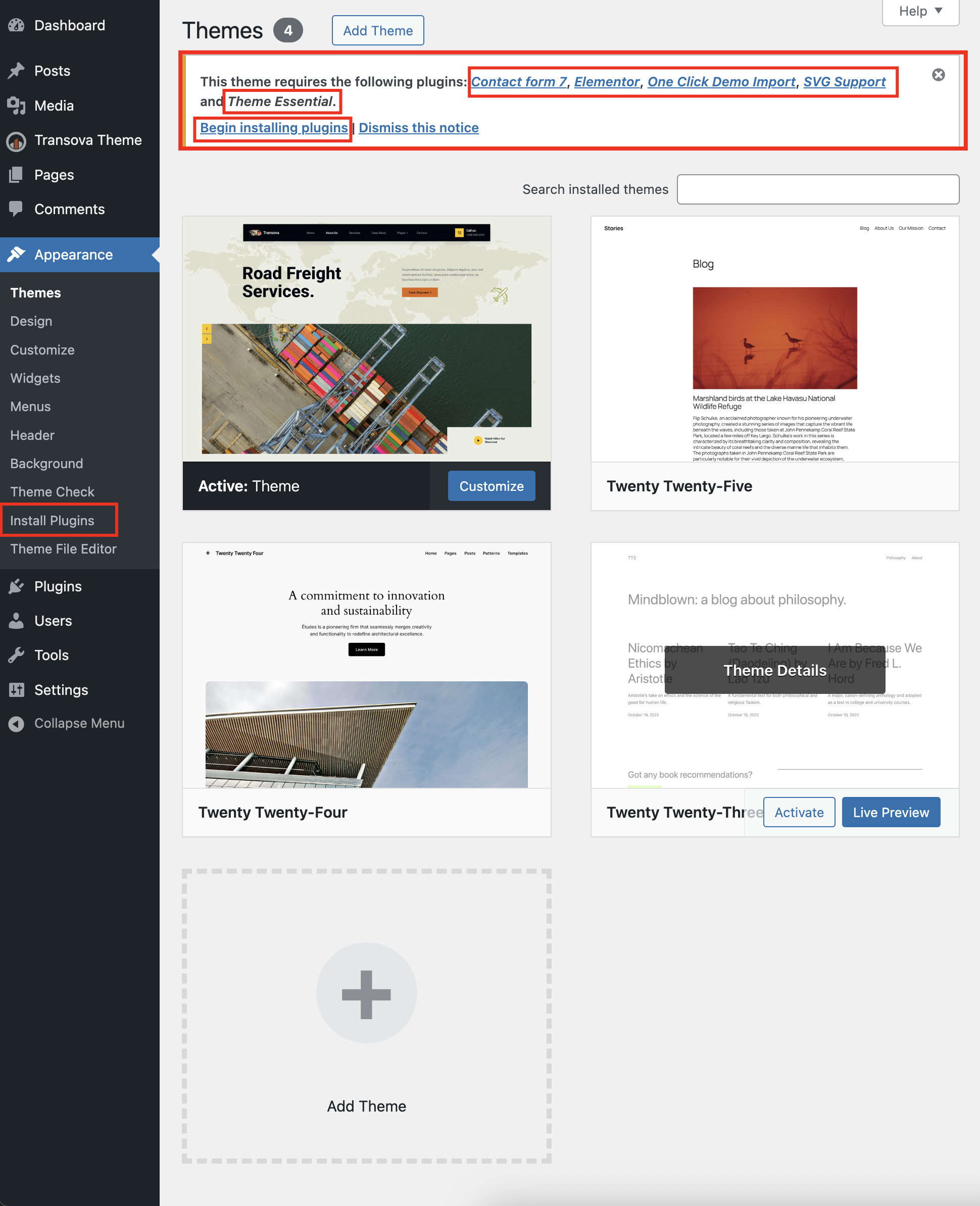 Once you activate the Transova theme You will get a notice for installing the required plugins. # Step 01: Click on Begin installing plugins to install required plugins.