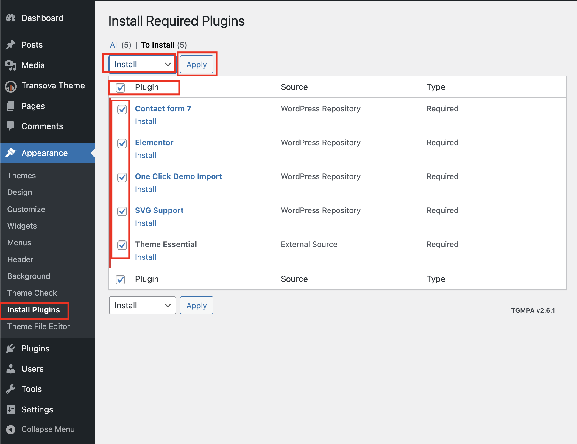 # Step 02: Select all required plugin, From the top dropdown menu select Install and click Apply.
