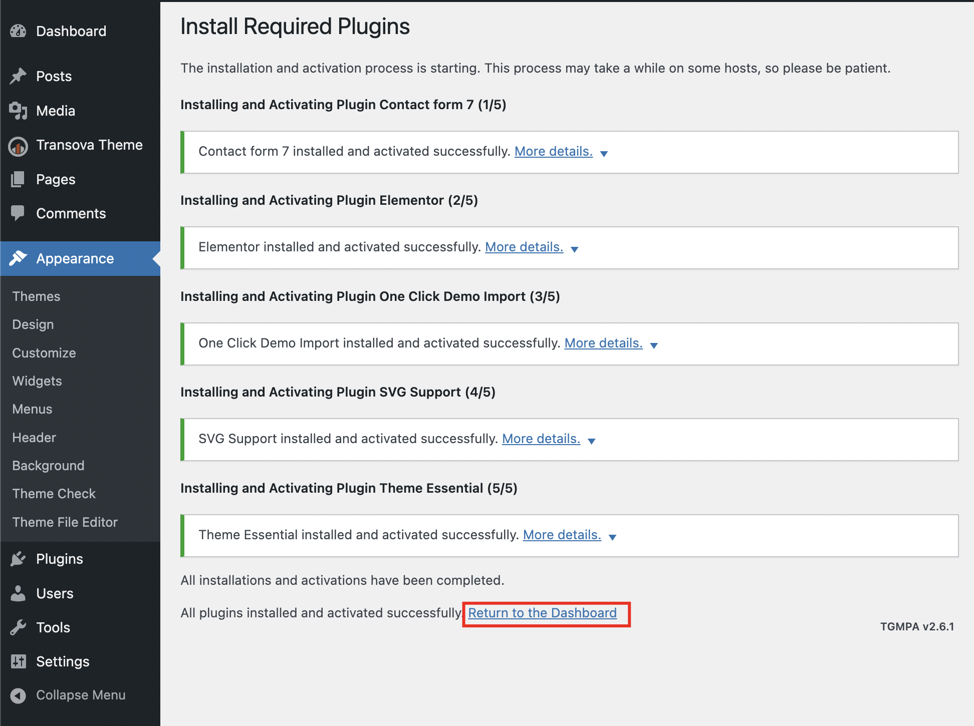 # Step 03: After Install all plugins successfully click Return to Required Plugins Installer.